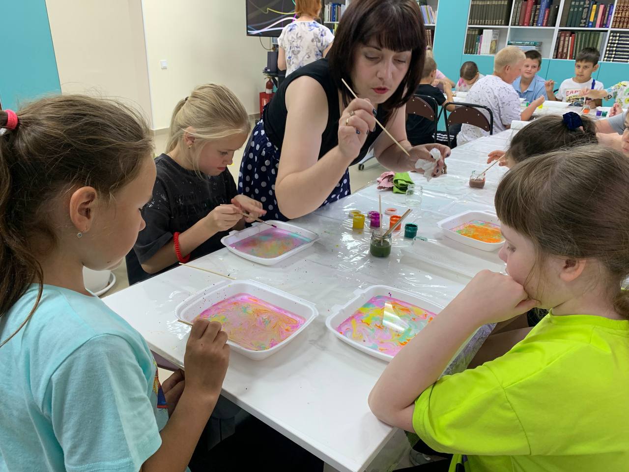 🎨 Не обошлось и без творческой составляющей! 2 отряд отправился на мастер-класс «Эбру», где ребята научились создавать удивительные рисунки на воде. Это было настоящее погружение в искусство, и все остались в восторге от полученных навыков!