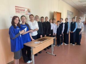 Ребята раздавали символические кусочки «блокадного хлеба», параллельно с этим, рассказывали о трагических событиях блокады и о героизме ленинградцев.
